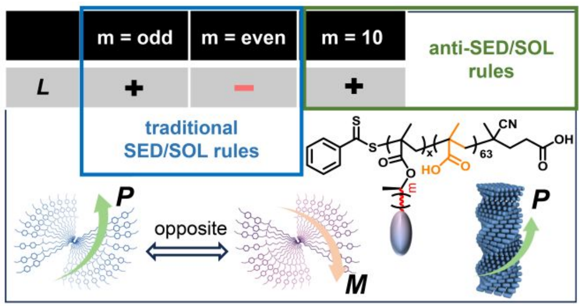 实现对聚合物超分子手性的精确控制是科学家面临的一大挑战,相关科学问题在近年受到了广泛关注。然而,通过外部刺激调节超分子手性,需要改变超分子组装体所处的环境,如溶剂、温度、光辐射以及化学添加剂等,这不利于手性纳米材料的应用和发展。因此,构建一个简便通用的策略实现对聚合物体系中超分子手性的调控至关重要。本文利用“奇偶效应”对分子结构进行设计,通过分子结构的微小改变即可实现超分子组装体在手性表达上的调控。在这项研究中,我们采用聚合诱导手性自组装(PICSA)策略来创建手性侧链型氰基联苯嵌段共聚物组装体。通过对手性氰基联苯单体上的柔性间隔基长度进行调节,可使组装体内的氰基联苯介晶在超分子不对称排列中表现出两种不同的奇偶效应。研究结果表明,氰基联苯介晶的液晶特性显著地影响其手性光学活性的大小和符号。这些发现对于具有手性光学功能的聚合物组件的设计有着重要的意义。