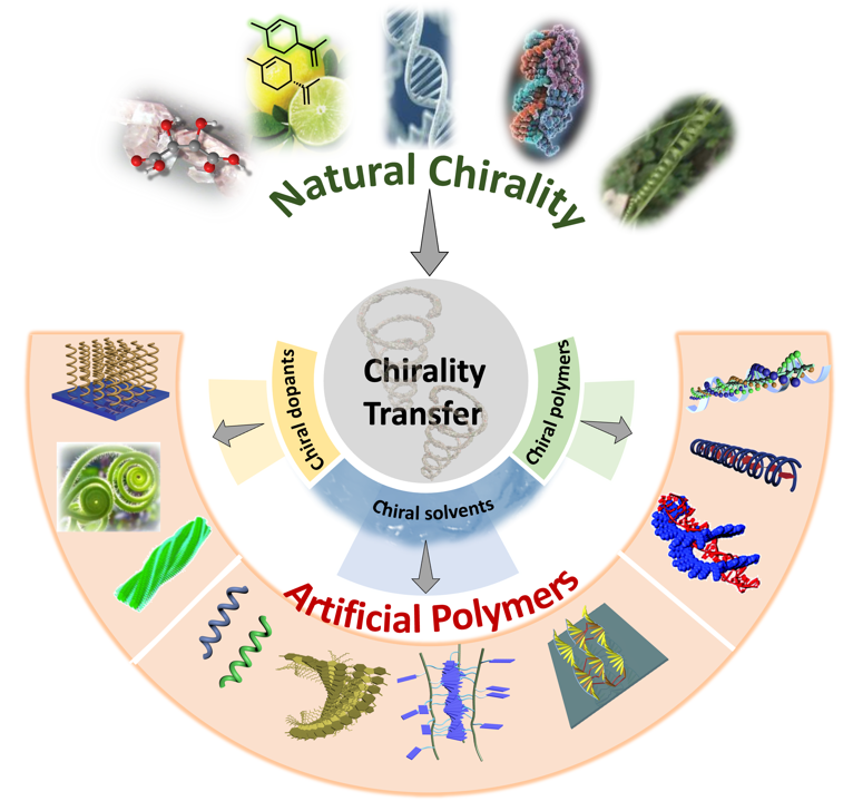 手性高分子的合成是手性材料和化学领域中备受关注的研究热点。然而,通过化学合成或不对称催化所制备的手性高分子,往往需要涉及昂贵的手性试剂和繁琐的合成路线。因此,利用手性传递的方式在非手性高分子中诱导手性的方法备受关注。受自然界启发,研究人员倾向于设计合理的相互作用系统,通过精确的手性信息传递,将天然物种中的手性信息转移到人工高分子中,从而构建大分子/超分子手性。本文综述了从天然手性物质(包括手性掺杂剂、手性溶剂和手性聚合物)到非手性人工高分子的手性转移的典型案例,旨在为研究手性高分子的制备提供一定的参考。最后,作者进一步简要介绍了开发新型功能手性高分子材料的未来范围、机遇和挑战,为该领域的研究和发展提供了新思路和新方向。