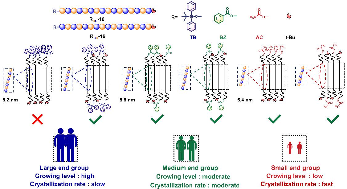 由于分子量分布和化学结构的精确性在聚合物结晶行为中起着至关重要的作用,离散寡聚物成为研究聚合物结晶行为的理想候选材料。特别是对于低分子量聚合物,其动力学与弛豫行为显著受到端基的影响。然而,受限于高分子聚合物在分子量、分散性以及链缠结等方面的复杂性,阐明端基对结晶行为的影响具有挑战性。近日,我们以ε-己内酯和γ-丁内酯作为单体,采用迭代指数增长策略,精确合成了具有不同端基的离散交替共寡聚物(o(γ-BL-alt-ε-CL)s),并系统研究了其结晶与熔融行为,并突出了端基在共寡聚物结晶与熔融过程中的作用。