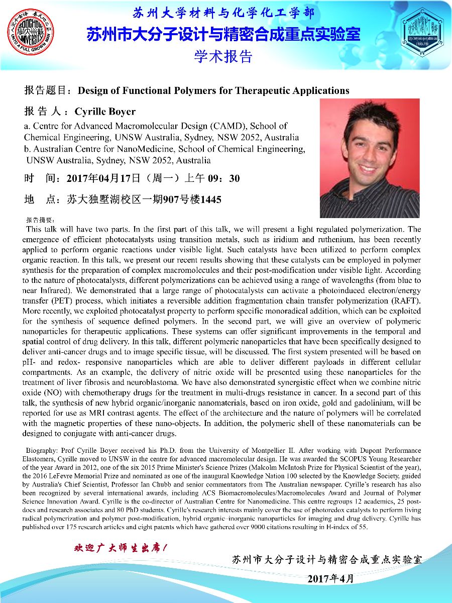 Cyrille Boyer 教授报告:Design of Functional Polymers for Therapeutic Applications
