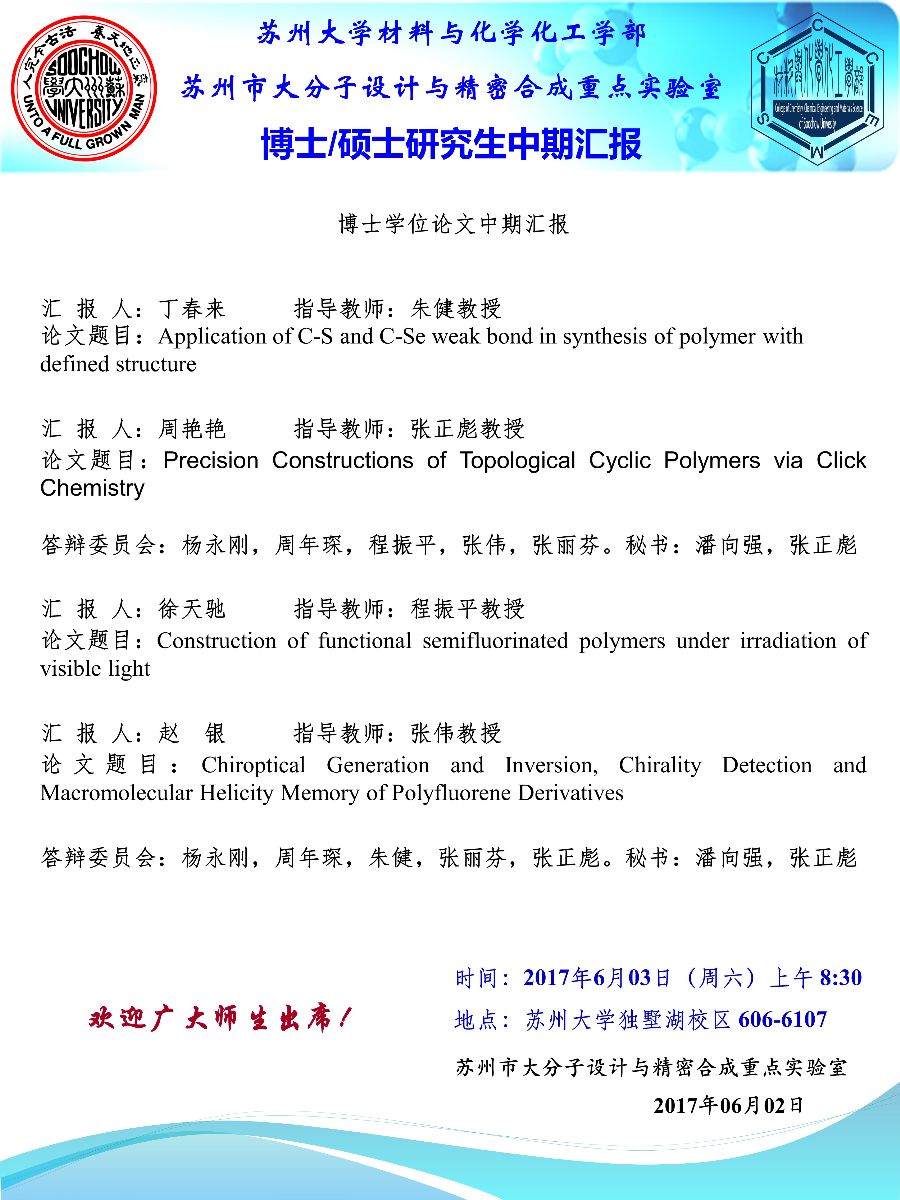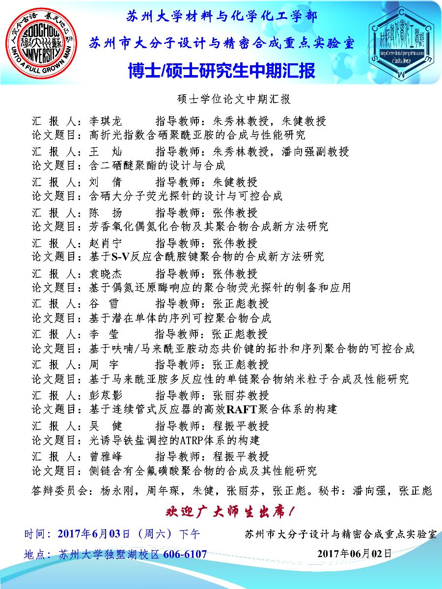 2017年06月03日,上午08:30,苏州市大分子设计与精密合成重点实验博/硕士中期答辩在606-6107成功举办。杨永刚教授,周年琛教授,朱健教授,程振平教授、张丽芬教授,张正彪教授担任评委,张正彪教授、潘向强副教授担任会议秘书。