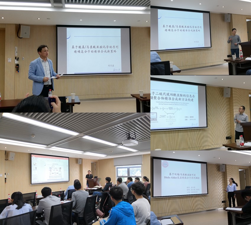 研讨交流会于2019年3月30日进行,以1位博士后和6位研究生的报告为主线,具体内容如下:课题组博士生黄智豪作主题为“Binary Tree-Inspired Digital Dendrimer”学术研讨。硕士研究生孟凡英、刘宝磊、施秋楠分别进行了主题为“基于呋喃/马来酰亚胺可逆 Diels-Alder 反应的高分子序列调控”、“巯基/马来酰亚胺化学的序列精确高分子的精准合成新策略” 、“基于二硫代琥珀酰亚胺的信息存储聚合物精准合成新方法构建”的学术研讨。