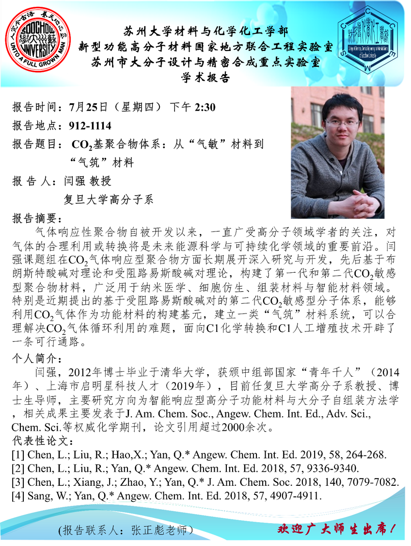2019年07月25日,我课题组邀请复旦大学闫强教授来课题组访问,并于15:00在912-1113作学术报告。