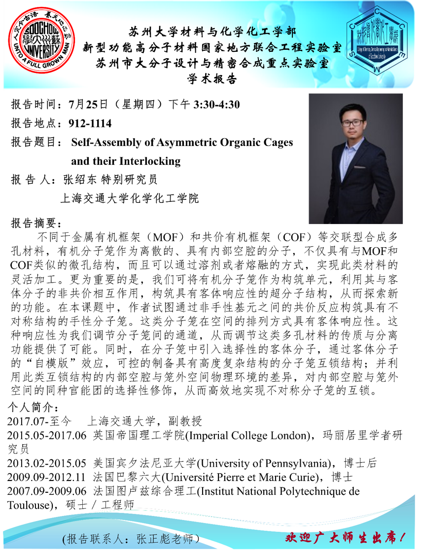 2019年07月25日课题组邀上海交通大学张绍东教授来课题组访问并作学术报告,并于15:30在912-1113作学术报告。
