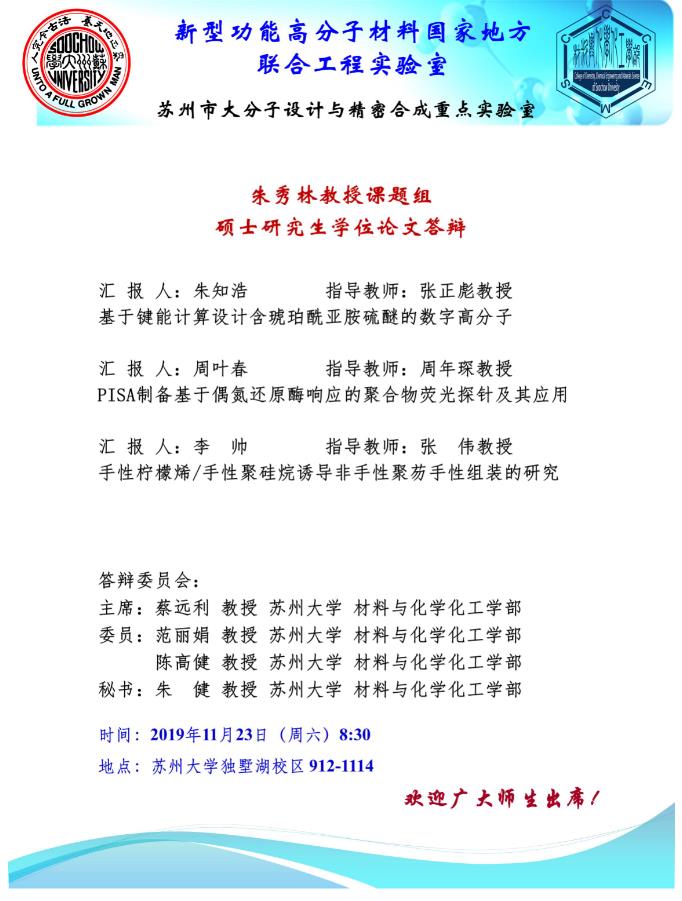 2019年11月23日,上午08:30,苏州市大分子设计与精密合成重实验室第二批硕士毕业答辩在912-1113成功举办。答辩委员会有来自苏州大学蔡远利教授,范丽娟教授,陈高健教授,其中蔡远利教授担任主席,苏州大学的朱健教授担任会议秘书。