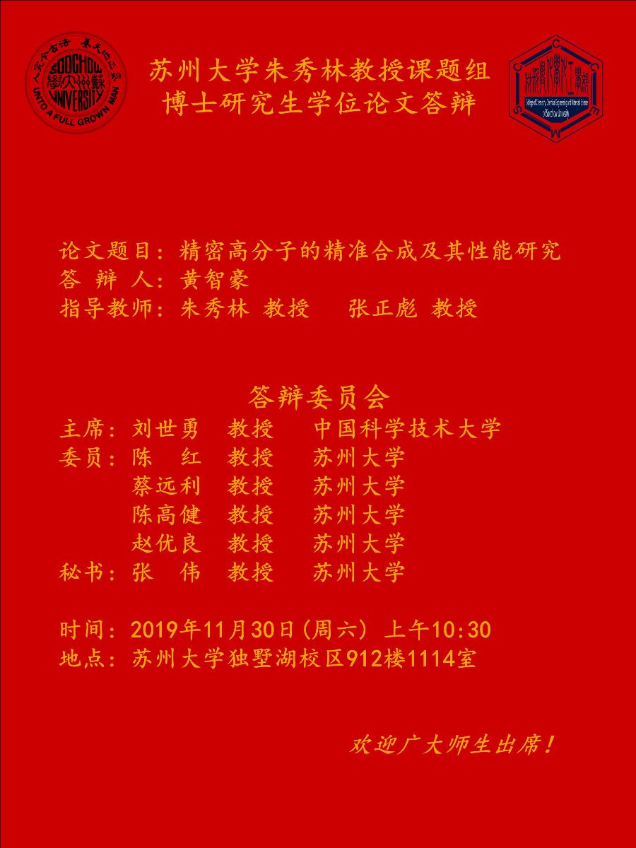 2019年11月30日,苏州市大分子设计与精密合成重点实验博士研究生学位论文答辩在912-1114成功举行。答辩委员会成员有:来自中国科学技术大学的刘世勇教授(委员会主席),苏州大学的陈红教授、蔡远利教授、赵优良教授、陈高健教授。张伟教授担任会议秘书。学位论文答辩于10:30准时开始,课题组博士生黄智豪上台进行学位论文答辩。