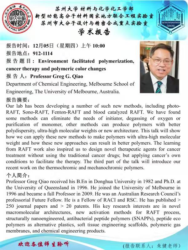 2019年12月5日课题组邀请澳大利亚Melbourne University Greg G. Qiao教授来课题组访问并作学术报告