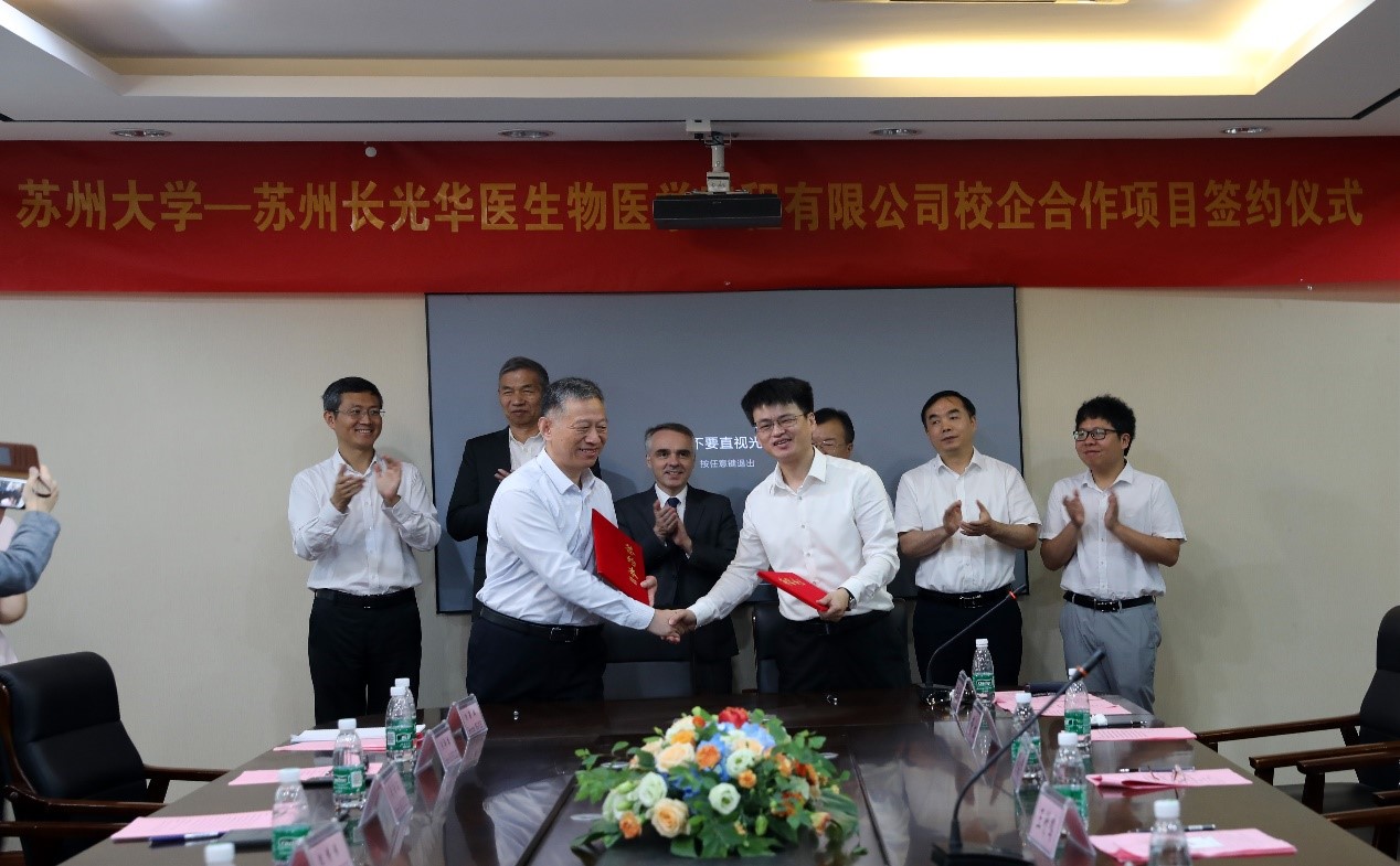2021年7月21日上午十点,苏州大学与苏州长光华医生物医学工程有限公司校企合作项目签约仪式在苏州大学独墅湖校区907-1222成功进行。会议首先由苏州大学副校长张晓宏致欢迎辞。随后苏州大学材料与化学化工学部主任张正彪及长光华医生物医学工程有限公司总经理王皓峰分别对学部及公司简况进行了介绍。接下来法国驻上海领事馆总领事纪博伟与苏州市政协副主席王竹鸣分别表达了对该次校企合作项目的殷切希望及祝福。最后在参会人员见证下,苏州大学材料与化学化工学部朱健教授与苏州长光华医生物医学工程有限公司研发总工常立峻分别代表双方签署了共建协议。会后参会人员友好合影留念并对实验室进行了参观。