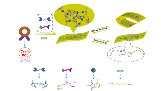 在高分子科学中,结构与性能的关系一直是一个永恒的话题。环拓扑结构由于其没有链端基,对聚合物性能有着显著的影响。在本工作中,由开环聚合,链端基改性以及双分子关环反应制备得到带有两个明确羟基的环状聚己内酯(PCL),并通过凝胶渗透色谱(GPC),核磁共振氢谱(1H NMR),红外光谱(FT-IR)和基质辅助激光解吸/电离飞行时间质谱(MALDI-TOF MS)对其进行了明确表征。利用环状PCL, 环己烷二异氰酸酯(HDI)和含四个羟基的交联剂交联制备得到具有形状记忆功能的聚氨酯材料。并利用呋喃和马来酰亚胺的DA可逆反应实现材料的自愈合。和线性聚合物相比,环状PCL具有更高的结晶度。研究发现,环状PCL和线状PCL相比,将导致更紧凑的网络结构,结晶度大大降低。聚氨酯的形状记忆效果并不取决于结晶度,而和交联程度有关。环状PCL表现了更高的形状固定率(~ 95%)比线性PCL(~ 80%)。而环状PCL的回复率则略微降低。形状记忆性能的差异是由于环线不同拓扑结构导致不同交联网络引起的。自愈合测试中,环状PCL和线状PCL都显示出良好的和近似的自愈合能力。这项工作为探索环拓扑结构对聚氨酯材料的形状记忆性能的影响提供了一个前所未有的例子,为阐明聚合物材料结构性能之间的关系赋予了一个新的视角。