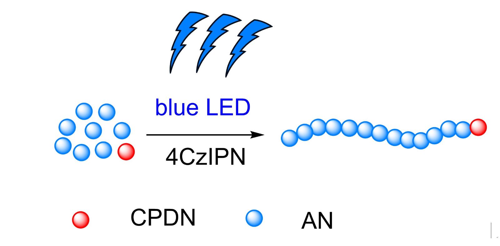 相比对人体伤害较大的紫外光,γ 射线以及高耗能的热外部刺激,非常有研究发展前景的发光二极管(LED)作为外部刺激具有许多显著的优点,例如波长分布窄,发热量低,耗能低,对人体无害等等。我们以1,2,3,5-四-(9-咔唑基)-4,6-二氰基苯(4CzIPN)为新型自由基引发剂,二硫代萘甲酸异丁腈酯(CPDN)作为链转移剂,在室温蓝色LED辐照下,成功构建了可逆加成断裂链转移聚合丙烯腈体系,并成合成出分子量可控,窄分布的聚丙烯腈(PAN)。这种聚合方法不管是在科学研究上还是对工业生产聚丙烯腈基碳纤维前驱体,都将会有一定的指导借鉴意义。
