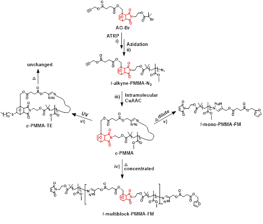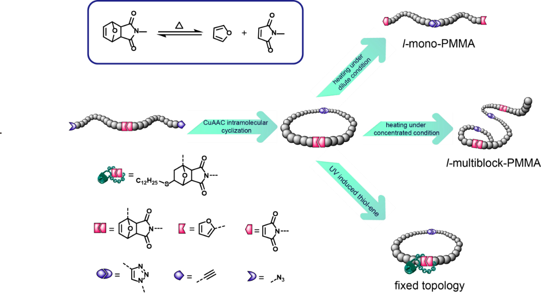 本文通过ATRP聚合获得了一端连有炔基一端连有叠氮基且中间包含有呋喃/马来酰亚胺动态加合结构的PMMA聚合物。之后,在稀释条件下利用CuAAC成环获得由于包含DA加合结构而具有热可逆性的环状拓扑聚合物。我们在高浓度条件下通过调节温度使环完全打开后分子链之间反应相连,从而实现由环状聚合物向高分子量多嵌段线性聚合物的转变。