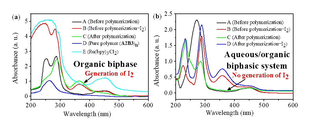 本文成功的在水/有机两相溶剂中构建了光引发的逐步转移-加成-自由基-终止聚合体系,在室温下实现了全氟双碘单体A和非共轭双烯单体B的交替共聚。紫外测试证明水的加入大大抑制了碘单质的生成,并进一步促进了聚合反应的进行。通过核磁分析,我们可以发现由两相聚合体系所得到的聚合物末端的官能团保留程度高于由相应的纯有机溶剂体系所获得的聚合物。所得到的聚合物通过还原反应去除聚合物链中的碘原子后使含氟聚合物的热稳定性提高。