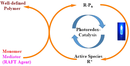 在本文中,采用2,4,6-四(对甲氧基苯基)吡喃鎓四氟硼酸和4-甲氧基苯甲醛两种新型的有机光催化剂,以二硫代萘甲酸异丁腈酯(CPDN)为RAFT试剂,在室温条件下,实现了甲基丙烯酸甲酯在各种LED灯(白灯、蓝灯、紫灯)下的“活性”自由基聚合。该体系能在广泛的可见光波长下进行,并具备一定的单体适用性,同时具有较好的控制性。