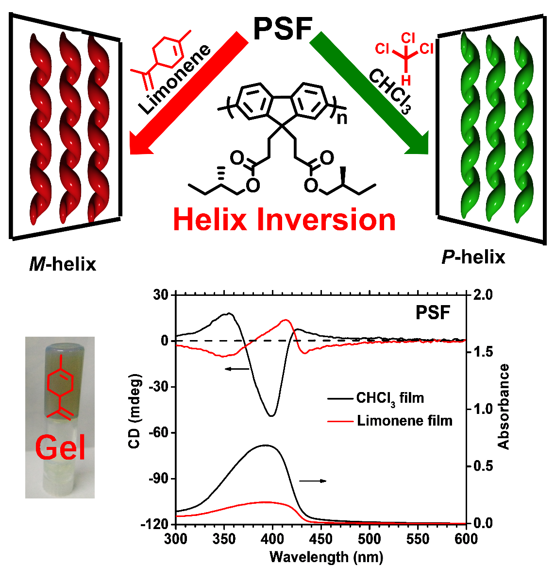 我们通过Suzuki缩聚合成了带有手性侧链的聚芴PSF。其在溶剂中有着不同的溶解性, 在消旋limonene中能够聚集组装,在氯仿等溶剂中能完全溶解。将聚合物的组装体溶液和氯仿溶液分别滴涂或旋涂成膜,我们发现其具有相反的手性信号(CD信号),这可能是因为二者聚合物链排列方式造成的差异。对于这两种膜,退火能够进一步增强手性。我们用紫外光谱、圆二色谱、荧光光谱等技术表征了这些分子的排列方式。实验结果表明,我们利用不同的溶剂刺激成功制备了P-和M-螺旋的超分子组装体,这为构建线性偏光有机电子设备提供了一种更便捷的方法。