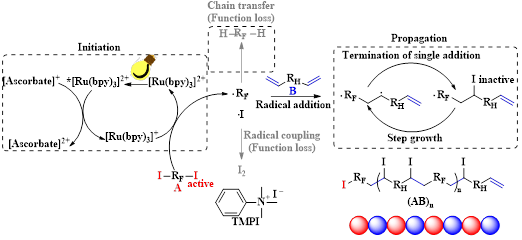 本研究主要实现了在室温可见光照条件下,全氟双碘单体A与非共轭双烯单体B的自由基交替共聚,并将该方法命名为逐步转移加成-自由基终止聚合。通过核磁氢谱和氟谱的测试及综合分析,我们揭示了聚合产物(AB)n的严格交替结构。通过对聚合行为的全面研究,我们对该聚合的机理做了详细的讨论以及解释。该聚合方法不仅提供了非共轭双烯单体可控自由基聚合的新途径,也实现了在温和条件下结构规整的含氟聚合物的制备。