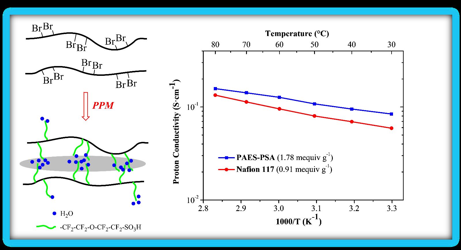 近几年,研究发现用全氟磺酸基团(Rf-SO3H)替换磺酸基团(-SO3H),可以更好的平衡质子交换膜的稳定性与质子传导率之间的关系,因为Rf-SO3H比-SO3H具有更高的酸性,有利于质子传输通道的形成。因此,我们的工作就集中在将全氟磺酸引入到高性能的聚芳醚砜的侧链上,为质子交换膜燃料电池的进一步发展提供思路。