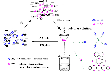 本文构建了一种制备拓扑结构的含硒聚合物的方法,利用硒化硼氢化交换树脂与端基功能化的聚合物反应。此方法条件温和,效率高,树脂可回收。端基功能化的聚合物可以通过ATRP,RAFT等方法获得。不同类型的聚合物(例如聚苯乙烯,聚丙烯酸酯类,聚乙酸乙酯,聚N-甲基吡咯烷酮)被成功的用于制备含硒聚合物,从而验证了此方法的通用性。此外,含有复杂拓扑结构的含硒聚合物(如环,稠环等)也可以利用特定结构的聚合物通过此方法进行合成。