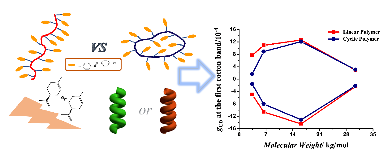 环状聚合物由于没有末端基,与其线性前体相比,表现出很多独特的性质,例如更小的流体力学体积、较高的玻璃化转变温度、更高的结晶速率等。本体系通过结合原子转移自由基聚合(ATRP)和“Click”反应(CuAAc)成功地制备了侧链含偶氮苯功能基元的环状聚合物。在1,2-二氯乙烷(DCE)/手性柠檬烯(R or S-limonene)混合溶剂中,我们比较了环状和线性聚合物在手性溶剂诱导非手性聚合物超分子手性组装上的区别。研究发现,环状聚合物的分子量越小,其拓扑约束效应对其超分子手性组装影响越大,并且随着分子量的增大,其拓扑约束效应减弱甚至消失。通过对偶氮苯进行顺-反(光致异构)和反-顺(热致异构)异构化调控,我们也成功地构建了基于环状聚合物的手性光开关。这些研究结果不仅丰富了非手性聚合物的超分子手性的应用范畴,同时对拓扑效应对超分子手性构建的影响提供了进一步理解。得到组装体是不同尺寸的小球,即同时为手性纳米粒子的制备提供了一种简单的方法。