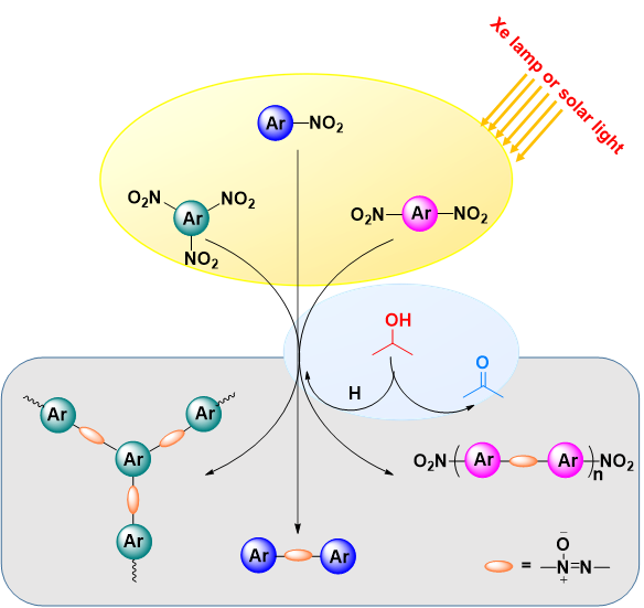 芳香氧化偶氮化合物与芳香偶氮化合物有着相似的结构与性质,其也有顺式和反式两种结构,并可在光照或加热条件下实现两种结构的转变,在光学材料领域有着潜在的应用价值。芳香氧化偶氮化合物合成方法面临的主要难题是反应的选择性以及反应条件的温和性,然而目前芳香氧化偶氮化合物合成方法中一般会有芳香胺或偶氮化合物生成,从而限制了反应的进一步拓展与应用。在此,我们开发了一种光还原法高效地将芳香硝基化合物还原成芳香氧化偶氮化合物,反应条件温和,体系无金属,反应选择性高。同时我们将该方法用于合成线性和超支化聚合物,所得聚合物可以在可见光区域内实现光致异构化的转变,在可见光驱动的光开关领域有着潜在的应用价值。