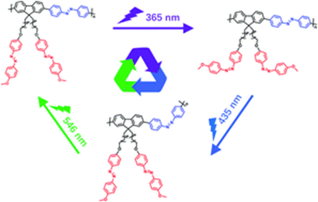 含偶氮苯(偶氮)的聚合物由于其由紫外/可见光或全部可见光驱动的独特的可逆反式 - 顺式光致异构化性质而被广泛应用。在此,设计并合成了共聚物AzoF8-alt-Azo,其在主链和侧链都含有偶氮单元。侧链偶氮(s-Azo)反式异构体的p-p *带最大吸收位于360nm(UV区),并且n-p *带最大吸收接近450nm(可见区)。主链偶氮(m-偶氮)反式异构体的p-p *带最大吸收位于425nm(可见区),并且n-p *带最大吸收接近520nm(可见区)。s-和m-偶氮单元的反式异构体的p-p *谱带和顺式异构体的n-p *谱带的吸收分离可以控制不同偶氮单元在主链和侧链的光异构化行为。交替的光照射顺序为365nm光(s-Azo的顺式和m-Azo的反式,SC-MT),435nm的光(s-Azo的反式和m-Azo的顺式,ST-MC)和546nm光(s-Azo和m-Azo的反式,ST-MT),其通过UV-Vis光谱监测。这表明通过上述策略可以成功获得相同聚合物链中的三种形式,即SC-MT,ST-MC和ST-MT。此外,在313nm,405nm,435nm和536nm的光照射下,在相同的AzoF8-alt偶氮链中成功实现了ST-MT,SC-MT,SC-MC和ST-MC四种形式。这些有趣的发现不仅会扩大含偶氮基聚合物的光异构化行为,而且也会为新型光学材料的设计提供线索。