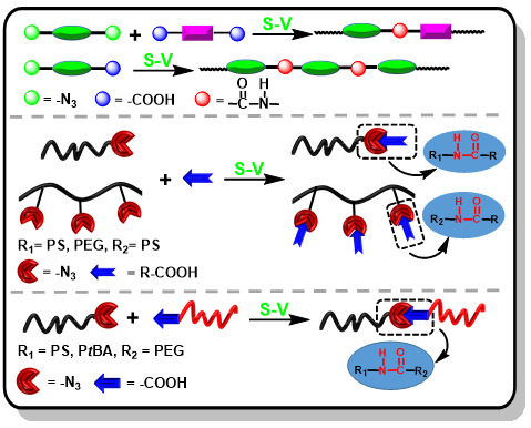 在本工作中,我们首次将催化的S-V反应用到聚合物的合成。在温和的条件下制备各种结构的聚酰胺,并且对其结构进行了详细表征。研究了单体烷基链长对聚合反应的影响,发现烷基链较长单体得到的高分子量的聚酰胺,收率在90%以上。随后将催化的S-V反应应用到聚合物后修饰和复杂拓扑结构聚合物的构建。利用不同结构的羧酸对聚合物末端进行酰胺化修饰,得到了末端含有酰胺键的功能性PS和PEG。进一步将其用于聚合物侧链酰胺化修饰。最后,将该反应用于聚合物和多官能团偶联剂之间的反应,聚合物之间的偶联,制备了酰胺键连接的均聚物、三臂星形聚合物、两嵌段和三嵌段聚合物。因此,催化的S-V反应有望作为一种高效的点击反应用于构建各种含有酰胺键的复杂拓扑聚合物。