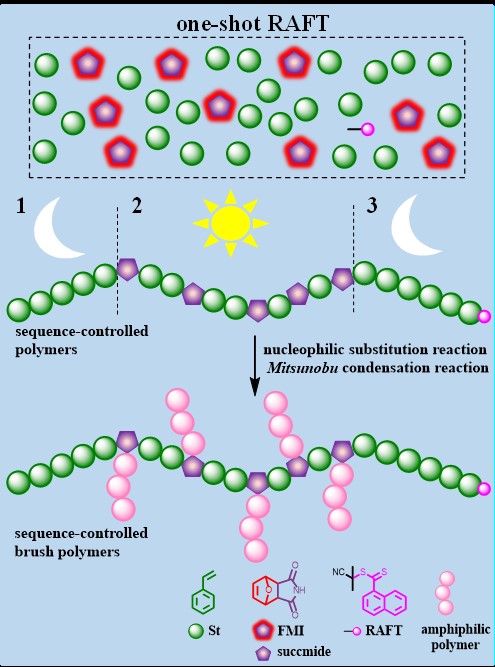 在本工作中,我们通过苯乙烯和呋喃保护马来酰亚胺的一次性进料,利用可逆加成-断裂链转移聚合(Reversible Addition-Fragmentation Chain Transfer Polymerization),成功制备了含有琥珀酰亚胺多反应性基团的不同序列可控高分子。不同序列可控高分子链中的琥珀酰亚胺作为多反应性基团可以通过亲核取代反应(nucleophilic substitution reaction)和Mitsunobu缩合反应进行高效的后修饰。我们通过核磁氢谱(1H NMR),红外光谱(FT-IR),大分子质谱(MALDI-TOF)和体积排除色谱(SEC)等测试证明了亲核取代反应和Mitsunobu缩合反应的高效性。最后,我们使用聚乙二醇单甲醚(mPEG,Mn = 400 Da)作为侧链,利用Mitsunobu缩合反应成功制备序列可控两亲性刷状聚合物。因此,本工作为序列可控刷状聚合物的制备提供了一种新方法。这也将进一步促进我们研究序列可控聚合物的结构与性质之间的关系及其潜在应用。