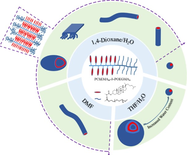 摘要:纳米颗粒的形貌对纳米材料的应用有重要影响。了解纳米颗粒的形成机理及定向控制纳米粒子自组装过程中的的形态具有重要意义,已经引起科学家广泛关注。我们设计并合成了一系列不同的疏水/亲水性嵌段比刷状两亲性液晶嵌段共聚物,PChEMAm-b-POEGMAn,并研究其不同条件下的溶液自组装行为。 我们对不同溶剂下 (四氢呋喃/水, 1,4-二恶烷/水, 和对N,N-二甲基甲酰胺) 的嵌段共聚物的溶液自组装行为进行了详细的研究。在四氢呋喃中主要形成胶束,巨型囊泡。在二氧六环/水中形成,圆柱形胶束,纳米纤维,流苏状纳米片,椭球性囊泡等。通过对胶束的内部结构进行解析,我们发现在二氧六环/水中形成的组装体中存在近晶相排列。而四氢呋喃/水中形成的组装体不存在近晶相排列。这主要是因为在组装的过程中,聚合物分子与溶剂的相互作用不同导致的。虽然两亲性与近晶相排列协同调控胆甾醇类刷状嵌段共聚物的自组装,但这两个因素在不同的溶剂中有不同的平衡。这种独特的超分子系统为形貌可控的的高级功能纳米材料的设计提供了一种新的策略