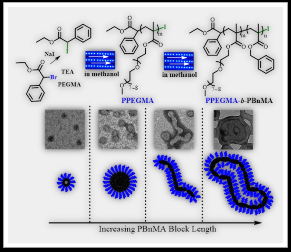 本工作利用原位溴-碘转换活性自由基聚合的方法成功实现了聚合诱导自组装过程,分别以PPEGMA为亲水链段,PBnMA为疏水链段,通过调节亲疏水链段比,得到了球形、蠕虫状、囊泡等不同形貌不同粒径大小的聚合物胶束。原位溴-碘转换活性自由基聚合方法搭建了原子转移自由基聚合和碘转移自由基聚合的桥梁,巧妙的克服了原子转移自由基聚合体系中过渡金属元素的残留和碘转移自由基聚合中碘引发剂不易保存的缺陷,利用原位溴-碘转换活性自由基聚合的方法实现聚合诱导自组装是获得不同形貌的聚合物胶束的有效途径。