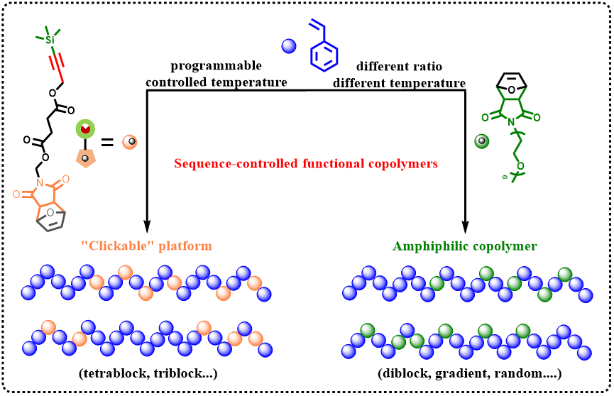 我们课题组之前已经提出了休眠单体策略以合成序列可控聚合物,但是我们采用的多是小分子单体,马来酰亚胺在聚合物中的分布对聚合物的性能影响并不是很突出。在本工作中,我们设计并合成了含有“可点击”基团或亲水性基团的功能性马来酰亚胺,并通过休眠单体策略成功合成了高级的序列可控功能性聚合物,并探索了亲水性单体对聚合物热性能的影响。首先,我们通过更高级多变的程序控温成功合成了具有“可点击”基团的高级序列控制聚合物(三嵌段共聚物,四嵌段共聚物)。并通过一系列测试表征(核磁氢谱,体积排除色谱,大分子质谱)证明了其序列结构。这部分工作再次验证了休眠单体策略在序列可控聚合物合成中的强大可行性,并且“可点击”基团的存在为我们将来引入其他功能性基团提供了可能。为了更加客观地研究序列对聚合物性能的影响,我们使用六甘醇单甲醚作为亲水基团合成了相应的休眠单体FHME,并通过改变聚合温度或者使用程序控温来制备具有不同序列的两亲性共聚物(包括二嵌段共聚物,梯度共聚物和无规共聚物);还通过改变初始单体投料比来制备具有不同HME含量的序列可控共聚物。最后,在对所制备的序列可控聚合物的热性能的初步研究中,我们发现聚合物中亲水性单体的含量和分布对聚合物的热性能有着显著的影响。这些初步发现将促使我们在以后的工作中进一步探索序列可控聚合物结构与性质之间关系。