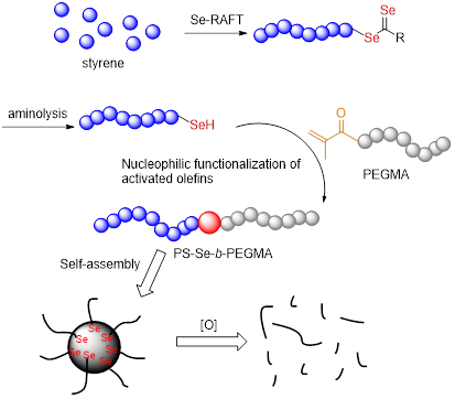 本工作利用二硒代酯调控苯乙烯聚合,制备二硒代酯封端的聚苯乙烯,进一步胺解原位制得硒醇,利用其与活性双键高效的亲核加成反应制备两亲性嵌段聚合物。亲水亲油链段比例可以通过活性调控有效的调节,从而制备预期的组装体,由于硒原子对氧化剂敏感,该组装体成功实现了对药物的可控释放。