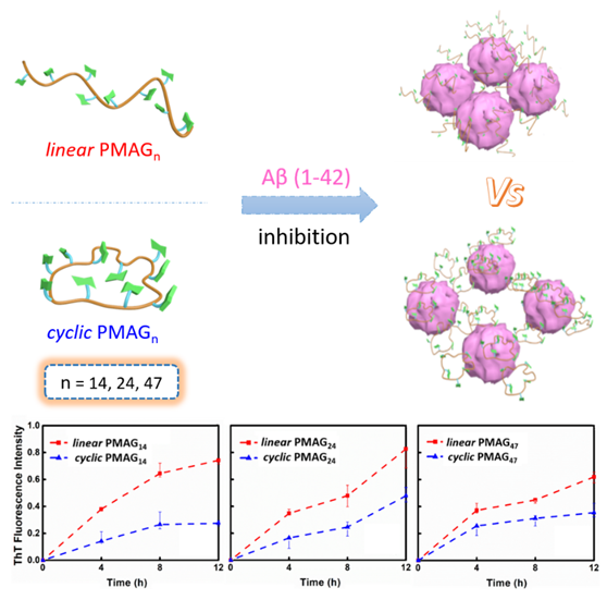 为了系统地研究糖聚合物结构对蛋白质相互作用的影响,首次通过ATRP和CuAAC“点击”反应及脱保护策略,制备了具有三个聚合度(n = 14, 24, 47)的带有半乳糖侧链(环状PMAGn)的环状含糖聚合物。通过与具有相同分子量的线性前体比较,环状PMAGn在研究中显示出凝集和抑制蛋白质的独特性质。更令人印象深刻的是,环状PMAGn很好的突出了环状拓扑结构的优势。例如,与相应的线性对应物相比,环状PMAGn显示出优异的抑制能力以抑制淀粉样蛋白从Aβ(1-42)聚集形成并阻断细菌和半乳糖修饰的表面之间的特异性相互作用。这一有趣的发现提供了新的见解,即环状糖聚合物的结构可能能够优化结合或抑制生物过程中蛋白质的能力。