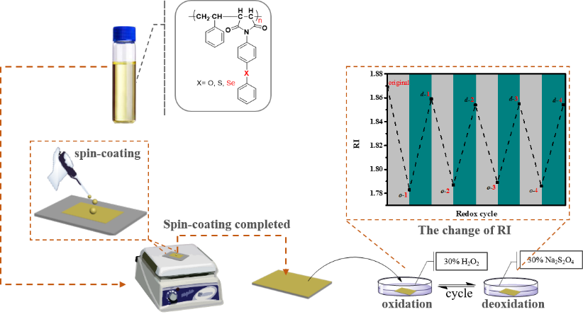 本研究中,合成了N-取代硒基苯基马来酰亚胺衍生物(例如N-(4-硒-苯基)-苯基马来酰亚胺(SePMI),将其并与苯乙烯衍生物(苯乙烯或(4-苯基硒)苯乙烯(PhSeSt))共聚。通过可逆加成-断裂链转移(RAFT)聚合实现结构控制。这些聚合物表现出良好的热稳定性和较高的折光指数,并且在大多数有机溶剂中具有良好的溶解性。另外,硒取代部分可被氧化后在还原,这样在氧化还原过程中可以改变聚合物的折光指数,可能被用作氧化还原传感器。