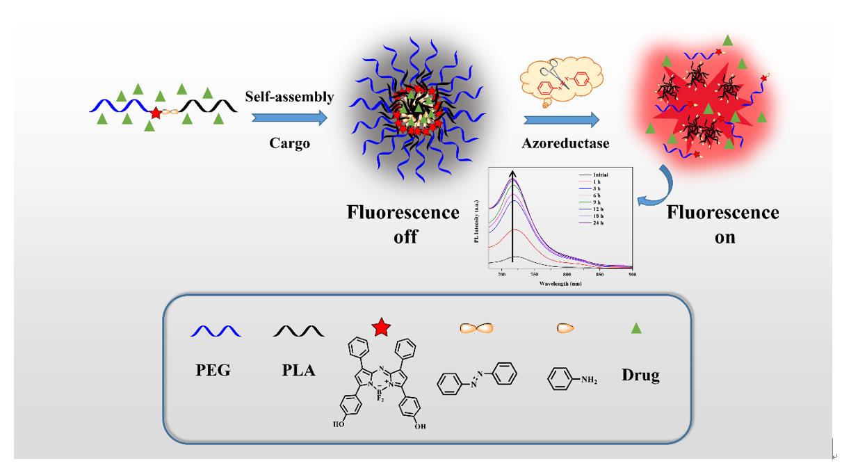 近红外荧光探针具有高效,灵敏且体内背景干扰低的优点,在生物传感和生物成像中起着重要作用。众所周知,偶氮苯衍生物具有光致异构化性能,并且是偶氮双键可被偶氮还原酶裂解的药物,是药物递送和生物学检测中独特的酶反应候选物。在此,合成了具有生物相容性的两亲性嵌段共聚物的新型近红外探针。与近红外荧光基团AzaBODIPY(硼二吡咯烷酮)相连的偶氮苯基连接亲水(PEG)和疏水(PLA)链段,形成两亲嵌段共聚物PEG-AzaBODIPY-AZO-PLA。 PEG398-AzaBODIPY-AZO-PLA144自组装成载药球形胶束。由于聚集诱导的猝灭(ACQ)效应,组装体胶束是无荧光的。胶束在偶氮还原酶作用下,PEG和PLA区段由于偶氮键的裂解而断开,这导致了胶束的破坏并伴随着药物的释放。在偶氮键被打断后,荧光分子解除ACQ效应激活了近红外荧光的发射。此外,随着药物释放,聚合物荧光强度持续增加。这种偶氮还原酶响应的药物释放证明了在人肠结肠生物传感和药物控制释放中的潜在应用。