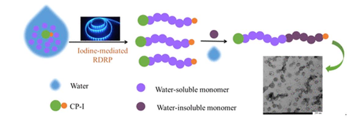 可见光诱导的碘调控活性自由基聚合反应条件温和,操作简单,是聚合物设计与合成的一种有效途径。在本文中,采用水这种绿色溶剂进行碘调控的活性自由基聚合,利用水分子中的氧原子与烷基碘引发剂形成的卤键,在蓝光下成功实施了甲基丙烯酸酯类单体的可控聚合。详细探究水在聚合体系中的作用,我们发现,水不光是一种绿色溶剂,更是一种绿色催化剂。此外,通过由水溶性单体制备的大分子作为引发剂,进行油溶性单体的乳液聚合,得到的两亲性嵌段共聚物在水中原位自组装得到了球形纳米粒子。