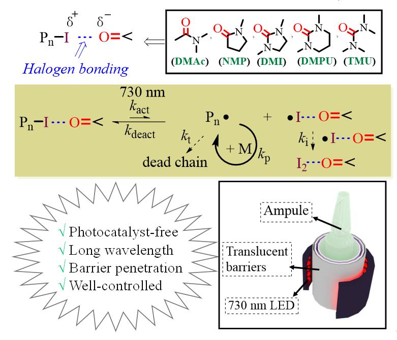 最近,随着光电技术的快速发展,光控策略已广泛用于聚合系统中,并且已开发了多种光控RDRP,可以实现快速“打开”和“关闭”聚合体系。在光聚合过程中,光催化剂的作用可谓举足轻重,作为光吸收,能量迁移和电子传输的物质起着至关重要的作用,但是光催化剂的残留、毒性问题以及不可预测的副反应严重阻碍了光聚合体系的应用。在本工作中首次实现在不添加光催化剂的情况下,使用烷基碘化物(如2-碘-2-甲基丙腈,CP-1)作为引发剂,在室温下进行了甲基丙烯酸酯的近红外(NIR)光控碘调控的可逆失活自由基聚合(RDRP)。创新性的以含羰基化合物(如1,3二甲基-2-咪唑啉酮(DMI)等)作为溶剂和催化剂,采用长波长λmax = 730 nm发光二极管(LED)为光源进行聚合,组成了最简单的光控RDRP体系:单体、引发剂和溶剂。该体系可很好地控制分子量和分子量分布(Mw/Mn <1.21),从聚合动力学,多次可控的“开-关”和扩链实验证实了RDRP的“活性”特征。重要的是,各种厚度的猪肉和A4纸也无法阻挡“光”前进的步伐,仍然可以成功实施聚合反应,该技术在医疗领域有潜在应用价值。