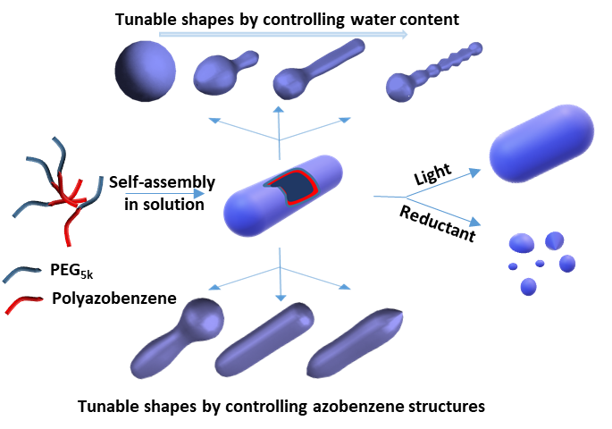 聚合物纳米颗粒的形态控制是研究生命科学以及制备功能纳米材料的基础。近年来的研究表明,由两亲共聚物自组装而成的非球形纳米颗粒在生物医学、能源等领域产生了巨大的影响。本论文将偶氮苯引入到管状囊泡中,对管状囊泡的制备,调控,以及刺激响应性能进行了一系列深入研究。多形态,包括蝌蚪状的、光滑的、针状的和串珠状的管状囊泡可以通过改变偶氮苯的化学结构或调整水的含量方便地制备。此外,管状囊泡还表现出光和氧化还原双重反应的特性,也可以诱导其形状转变。这些新型的智能管状囊泡在特定开关器件和药物释放等领域具有重要的潜在应用。