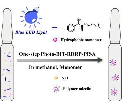 聚合诱导自组装(PISA)已为一种原位合成具有各种形态的高固含量聚合物纳米颗粒的有效策略。在这项研究中,通过原位光控溴-碘转化可逆-失活自由基聚合(Photo-BIT-RDRP)实现了一步式PISA。预先合成了水溶性大分子引发剂前体α-溴苯乙酸聚乙二醇单甲醚酯(mPEG1k-BPA),在蓝光照射下采用PISA的方法成功制备了聚合物纳米胶束mPEG1k-b-PBnMA和mPEG1k-b-PHPMA。通过原位Photo-BIT-RDRP的手段,只需一步法即可实现光控PISA工艺,既避免了传统ATRP系统中过渡金属催化剂的使用,又大大简化了纳米胶束的合成步骤。