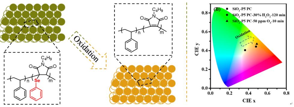 侧链具有不同硒含量的含硒马来酰亚胺聚合物通过自由基聚合的方式来得到。通过NMR,GPC,FT-IR,UV-vis以及EDS来确定聚合物的结构以及硒含量。不同的硒含量带来聚合物折光指数的变化,更重要的是,可以通过双氧水或者臭氧氧化的方式来改变其折光指数。最终我们将该聚合物制备成光子晶体实现对臭氧的可视化检测。