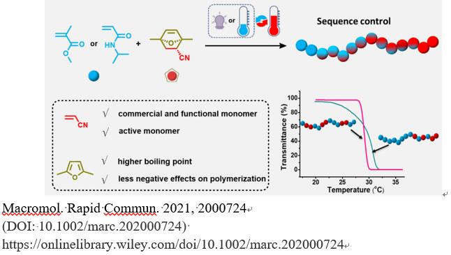 序列结构对聚合物性能有着重要的影响,聚合物序列结构调控已经成为聚合物性能调控的一种高效方法。例如,序列结构调控能够调控聚合物的结晶温度、水解行为、抗菌活性等。由于聚合物链增长过程对不同共聚单体的选择性往往较低,序列控制被公认为是高分子合成领域的挑战之一。发展高效的高分子序列控制方法也一直是高分子合成化学的重要课题。丙烯腈作为一种活性较高且商业化用途广泛的单体,其共聚物的序列调控难度较高且少有报道。发展丙烯腈共聚物序列结构调控的方法,将可能调控聚合物的性能并开发新型功能性丙烯腈聚合物。
