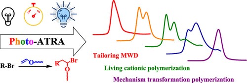 聚合物分子量分布对材料性能具有重要影响。本文报道了一种潜在引发剂策略,可以在间歇式聚合中方便的对聚合物分子量分布进行调节。该策略通过结合光引发原子转移自由基加成反应(ATRA)及活性阳离子聚合实现。通过简便的外部光源的开关操作即可有效调节聚合无分子量分布,可包括峰形左偏、右偏、双峰、三峰分布及不同峰强度的SEC流出曲线。另外,该方法被进一步用来实现自由基到阳离子的机理转变聚合,为制备具有新颖结构的嵌段聚合无提供了新方法。