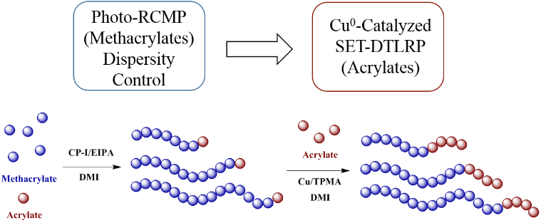 聚合物的分子量分布指数Đ,对聚合物的玻璃化转变温度、机械性、流变性等物理性能影响显著,分子量分布指数不同或分子量分布指数相同而分布“形状”不同的聚合物材料的性能都是有明显差异的。借鉴多年来RDRP方法在高分子设计合成方面的理论研究经验,开发出在保持聚合物“活性”情况下调控聚合物分子量分布的新方法并推动这类技术在工业生产中的应用是一项非常有意义的工作。本工作开发了一种结合可见光控制的可逆络合介导的活性自由基聚合(RCMP)和室温下单电子转移-退化链转移活性自由基聚合(SET-DTLRP)来调节聚合物Đ的新策略。在RCMP体系中,以甲基丙烯酸甲酯(MMA)为模型单体,丙烯酸正丁酯(BA)为封端试剂,2-碘-2-甲基丙腈(CP-I)和2-碘-2-苯基乙酸乙酯(EIPA)作为烷基碘引发剂来调节聚合物Đ。随后,在铜线的存在下,通过SET-DTLRP重新激活聚合物端链,成功制备了具有可调节Đ的嵌段共聚物PMMA-b-PBA,这充分证明了这是一种有前途的策略,可以保持“活性”聚合的特征,同时调节它们的分子量分布。