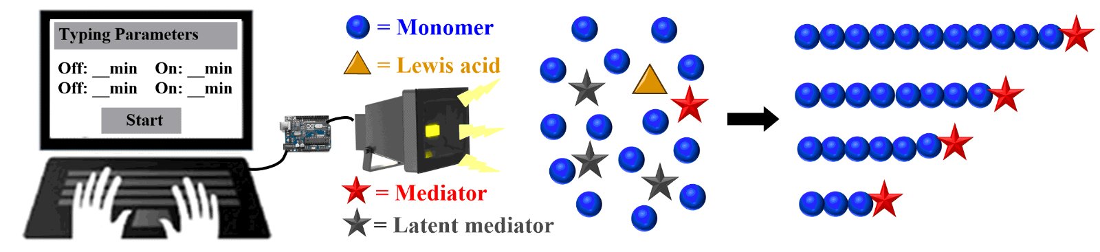 聚合物的分子量分布(MWD)是聚合物材料的关键参数之一。本文提出了一种在阳离子聚合中调节聚合物分子量分布的有效方法。提出了一种潜在调控试剂策略,并与时间编程相结合,在聚合过程中的不同时间生成调控试剂。通过调整外部光源,可以实现MWD曲线的宽度和形状的调节,得到了双峰、三峰和四峰分布,分布曲线宽度可控制在1.06~2.09。该方法制备的不同分子量分布聚合物通过扩链实验证明了其具有良好的链端保真度。此外,利用计算机控制的单片机对光源的时间编程的引入为利用人工智能进行聚合物合成开辟了途径。