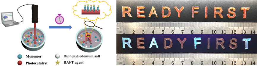 利用可控/活性聚合系统而发展的三维 (3D) 打印正在成为制造“活性” 3D物体的强大方法,并可进一步制备具有各种功能的材料。本文报道了一种在紫外 (UV) 到近红外 (NIR) 光的宽波长范围下光诱导自由基促进的阳离子可逆加成断裂链转移 (RAFT) 聚合方法。通过该方法制备了具有活性链末端,可控分子量和窄分散性(1.06-1.32)的各种聚(乙烯基醚)。受益于近红外光的穿透能力,采用了立体光刻3D打印技术(SLA)实现了具有不同厚度物体的单层、活性3D打印。此外,用荧光素单体对这些3D打印物体进行后功能化修饰提供了一种简便的方法来构建具有复杂功能的3D物体,此方法在防伪材料中具有潜在应用。