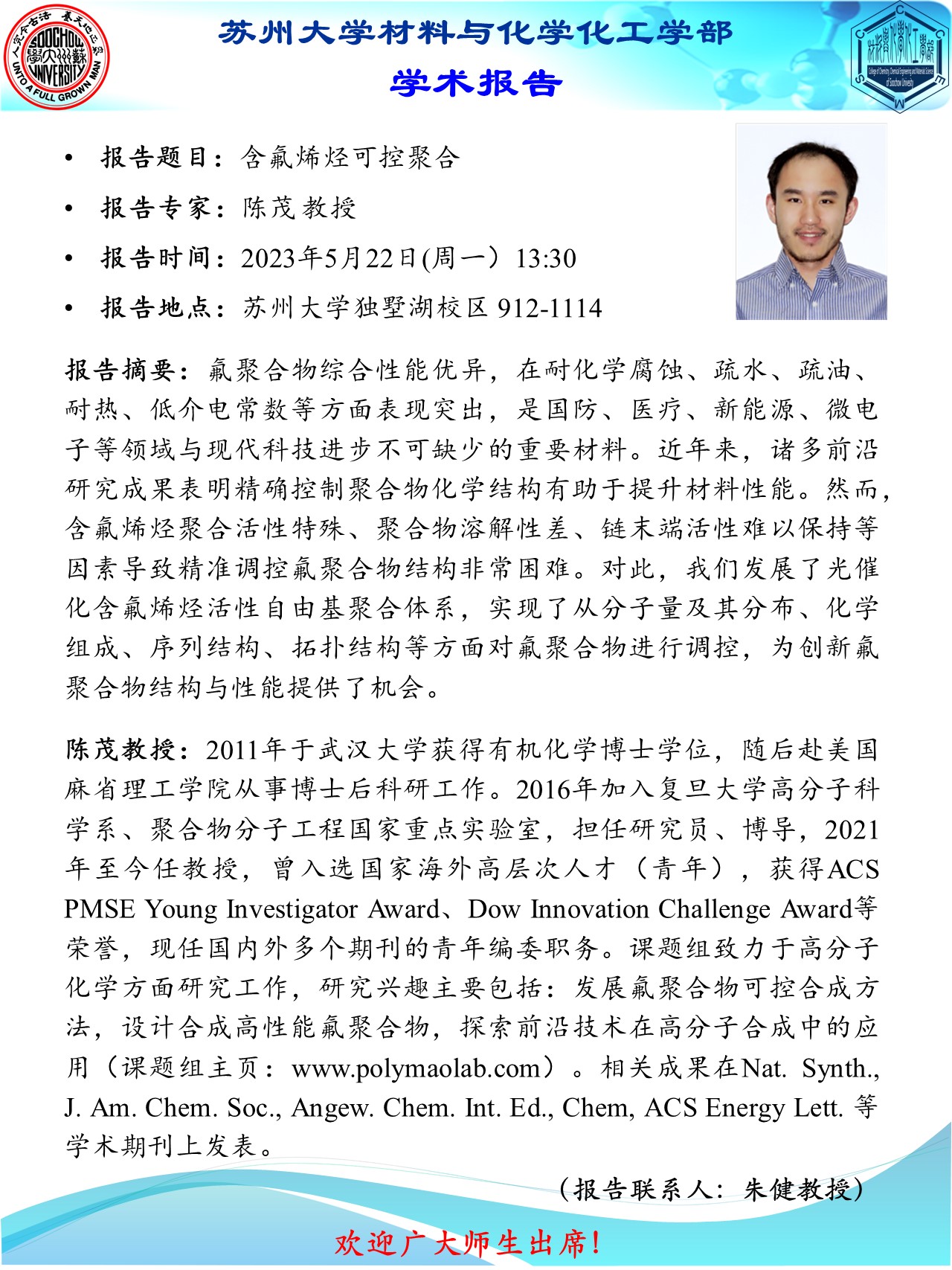 课题组朱健老师邀请来课题组访问并以“含氟烯烃可控聚合”为题作学术报告,报告于