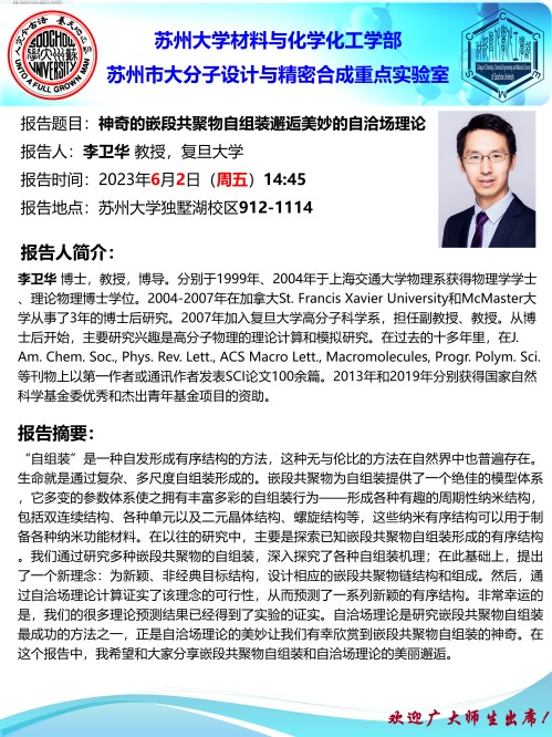 日,复旦大学李卫华教授受邀以“神奇的嵌段共聚物自组装邂逅美妙的自洽场理论”为题作学术报告,报告于