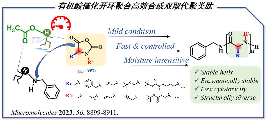 Yu, X.; Wang, Y.; Dong, Y.; Zhao, Y.; Zhang, L.; Xuan, S.;*Zhang, Z.* Efficient Synthesis of N-Methyl Polypeptides by Organic Acid Promoted Controlled Ring-Opening Polymerization of N-Methyl-α-Amino Acids N-Carboxyanhydrides.Macromolecules2023,56, 8899-8911.