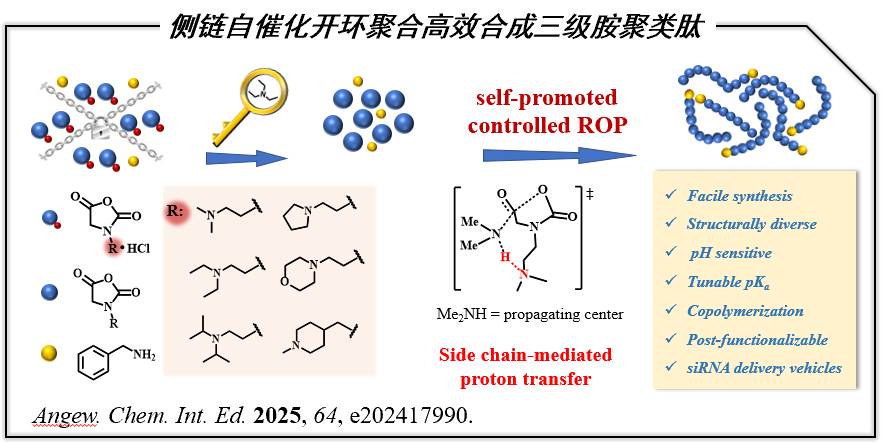 Liao, M.; Yao, Y.; Gan, K.; Su, X.; Zhao, N.; Zuckermann, R. N.;Xuan, S.;*Zhang, Z.* Self-promoted Controlled Ring-opening Polymerization via Side Chain-mediated Proton Transfer for the Synthesis of Tertiary Amine-pendant Polypeptoids.Angew. Chem. Int. Ed. 2025, 64, e202417990.