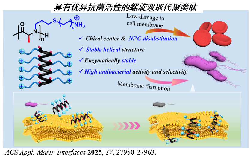 Ma, A.; Deng, X.; Wei, L.; Dong, Y.; Zhang, P.;Xuan, S.;* Zhang, Z.* High Antibacterial Activity and Selectivity of Cationic Disubstituted Polypeptoids with Stable Helices and Enzymatic Resistance.ACS Appl. Mater. Interfaces2025,17, 27950-27963.