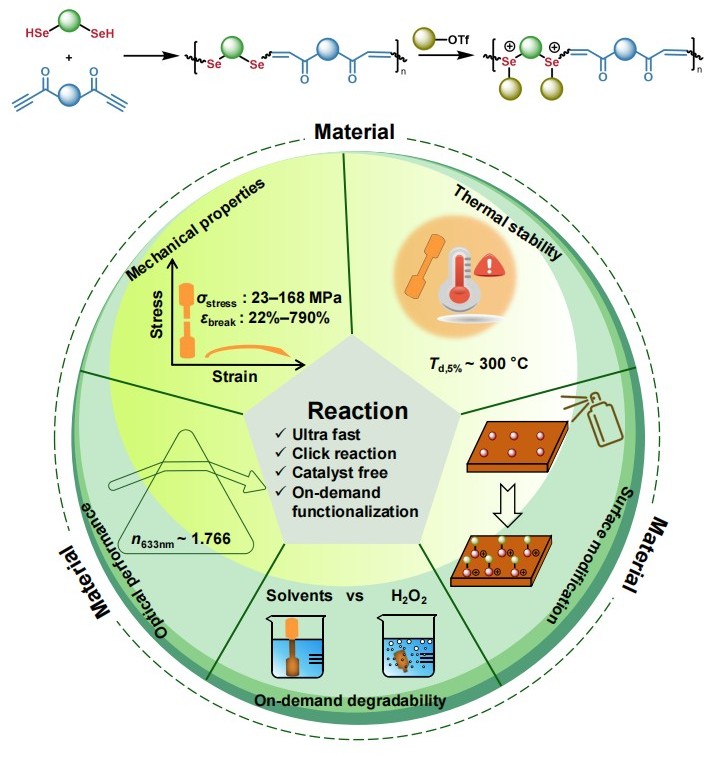 聚酯酰胺(PEAs)因其优异的力学性能、可生物降解性和生物相容性平衡而成为极具前景的生物材料,但功能多样性与环境适应性方面的局限仍制约其实际应用。本研究首次通过无催化剂的硒醇-炔点击聚合反应,成功制备了具有周期性硒原子嵌入的聚酯酰胺(Se-PEAs)。基于硒化学的独特性质,我们实现了材料性能的精准调控:所得Se-PEAs兼具可调的力学性能(从刚性塑料到弹性体)、卓越的热稳定性与高光学透明性;其可编程降解特性既能保证生理环境中的长期稳定性,又能在生命周期结束时实现快速氧化降解;表面硒鎓化修饰进一步赋予材料强效抗菌性且不影响力学性能。这种多功能特性使Se-PEAs成为生物医用植入体、可持续包装和高折射率光学器件的变革性材料。该研究不仅推动了功能高分子设计的发展,更揭示了硒化学在应对塑料污染与生态可持续性等全球性挑战中的重要潜力。