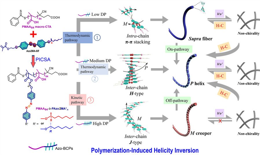 本工作系统地介绍了原位调节构筑单元的堆叠模式,进而调控偶氮苯聚合物超分子手性的多重翻转。文章报道了第一个聚合诱导螺旋翻转(PIHI)的自组装策略,即可原位聚合过程中实现偶氮苯构筑单元的受控堆积和动态立体突变,这一翻转过程无需任何外部刺激。结果证明由功能导向的 π-π 堆积、H-和 J-聚集之间的转变导致聚合物超分子纳米纤维的螺旋反转和多重手性光学翻转。进一步的光致异构和热回复实验表明,螺旋反转是通过热力学和动力学控制,路径依赖的相互转化之间微妙相互作用进行的。对PIHI的进一步研究能对聚合物体系中自组装过程、堆叠方式和超分子手性调节进行更深入的理解。我们的研究结果描述了一种调制聚合物超分子手性的有效方法,该方法在功能性聚合物材料的设计和构建中具有巨大的潜在应用。